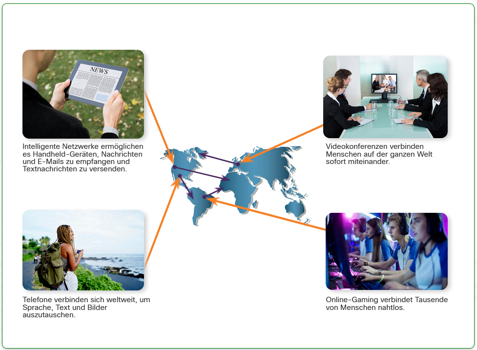 Das Internet ist nicht im Besitz von Einzelpersonen oder Gruppen. Das Internet ist eine weltweite Ansammlung miteinander verbundener Netze (Internetwork oder kurz Internet), die miteinander kooperieren, um Informationen unter Verwendung gemeinsamer Standards auszutauschen. Internetnutzer können über Telefondrähte, Glasfaserkabel, drahtlose Übertragungen und Satellitenverbindungen Informationen auf vielfältige Weise austauschen, wie in der Abbildung dargestellt.